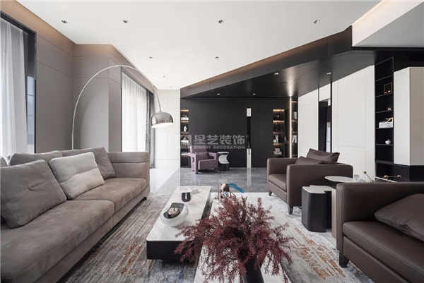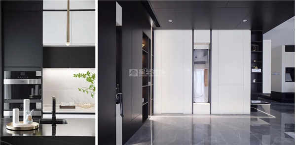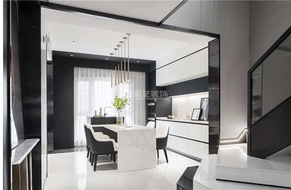 在客厅与餐厅的设计中,以素雅的焦磨黑、沉静的灰作为硬装底色配以暖咖、玫瑰金不锈钢的陈设调和,设计师通过诗歌所描绘的深远意境铺叙空间美学层次,以艺术激发生活的曼妙。